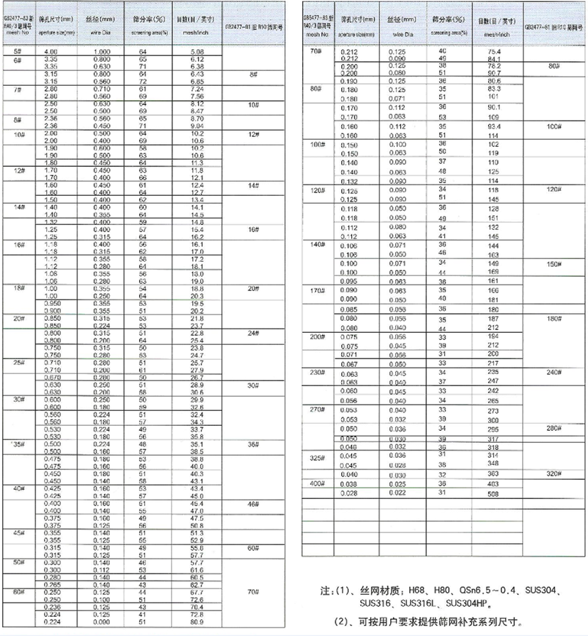 0.020mm(2.54~635目/英寸)網(wǎng)孔規(guī)格見表。